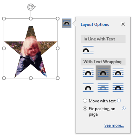 A third option for seeing Layout Options is to click the image, and you will see next to the upper right corner of the image box with blue lines and an upside-down horseshoe. Graphic versions of the text wrap options will appear.