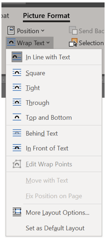 To control how an image and text interact, in the Picture Format tab in the Arrange group, click the Wrap Text.