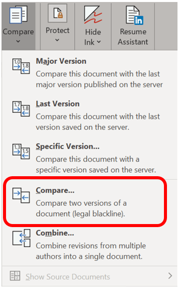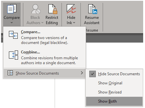 Word will now compare the two documents noting all differences. A new document will be created that combines the two. If your screen is not filled with a sidebar listing all differences known as the Reviewing Pane, a combined document marking all differences as tracked changes, plus the original and revised documents as another sidebar. If you see only one document go to the Review ribbon in the Compare group, click on the dropdown, and at the bottom where Show Source Documents now darkened click Show Both.