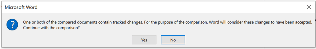If either of your documents contains tracked changes, Word auto accepts all changes. If you click No you will end the comparison process.