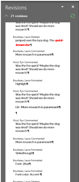 Now you can examine changes made to your beautiful document by the barbaric nitwit who didn’t track their changes. Use the Revisions pane to review each change individually. Click changes in the pane to jump to specific items.